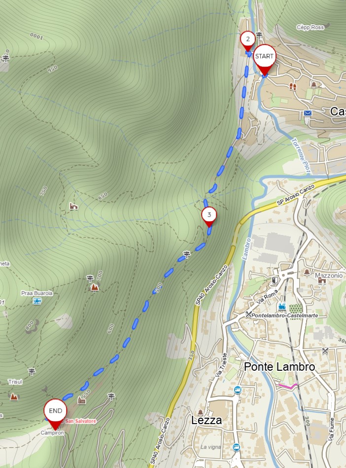 Il percorso proposto, permette di raggiungere l’Eremo di San Salvatore ed eventualmente da qui, raggiungere la Capanna Mara o l’Alpe del Viceré e quindi entrare nel sistema di sentieri della dorsale Como – Bellagio.