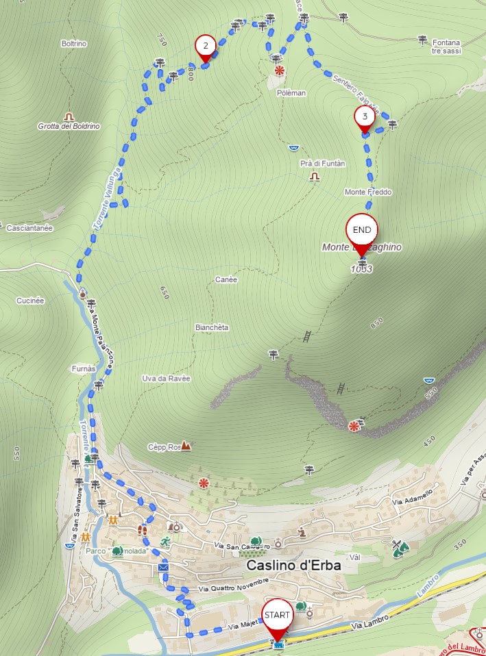 Dalla stazione TRENORD si raggiunge il centro del paese e poi il Parco degli Alpini (fare riferimento alla pagina “Dalla Stazione TRENORD” a Caslino), in circa 20 minuti.