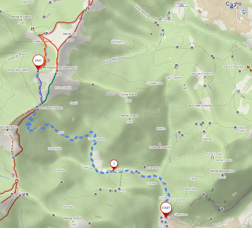 - Il secondo che parte dal rifugio, raggiunge la località denominata “Preaola” e risale la costa Nord (traccia arancione). Per questo itinerario (Blu) sono necessari circa 40 minuti, ma la salita alla vetta è meno ripida!