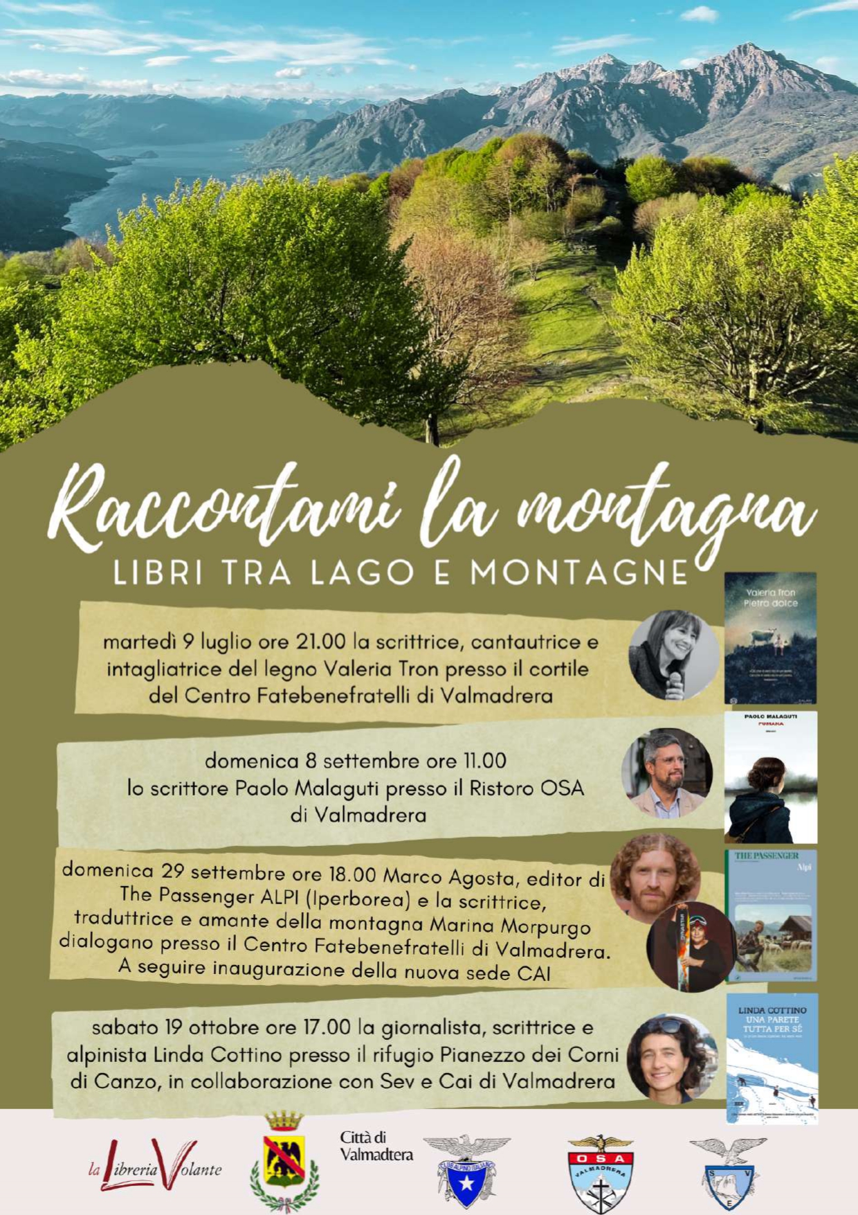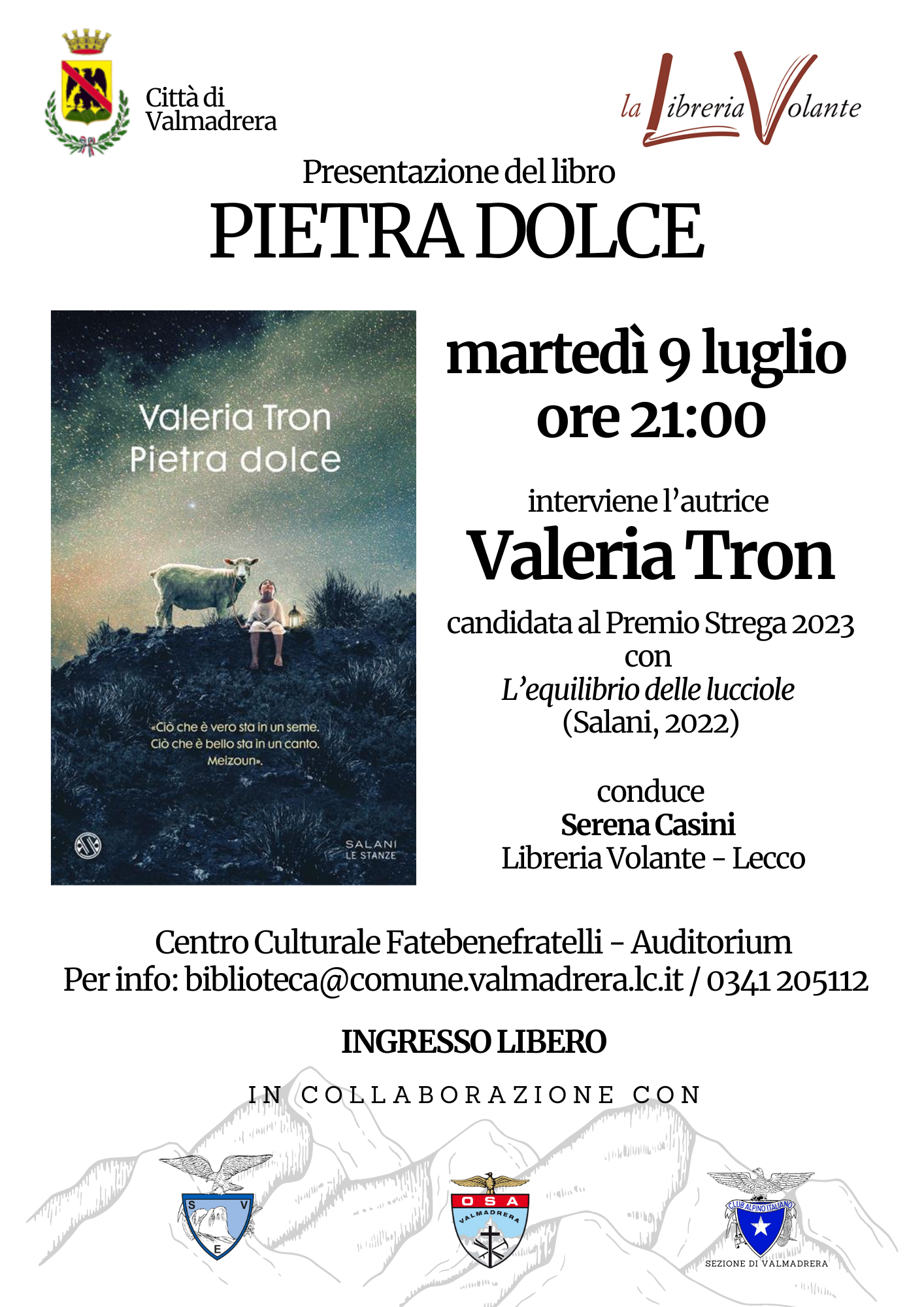 Valeria Tron - “PIETRA DOLCE”, martedì 9 luglio - Valmadrera La Biblioteca Comunale di Valmadrera e la Libreria Volante di Lecco, in collaborazione con le associazioni OSA, SEV e CAI di Valmadrera, presentano una serata fra scrittura e montagna. Valeria Tron, considerata la voce della Val Germanasca e della sua gente, parlerà del suo nuovo […]