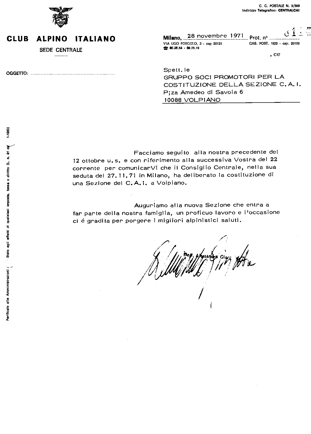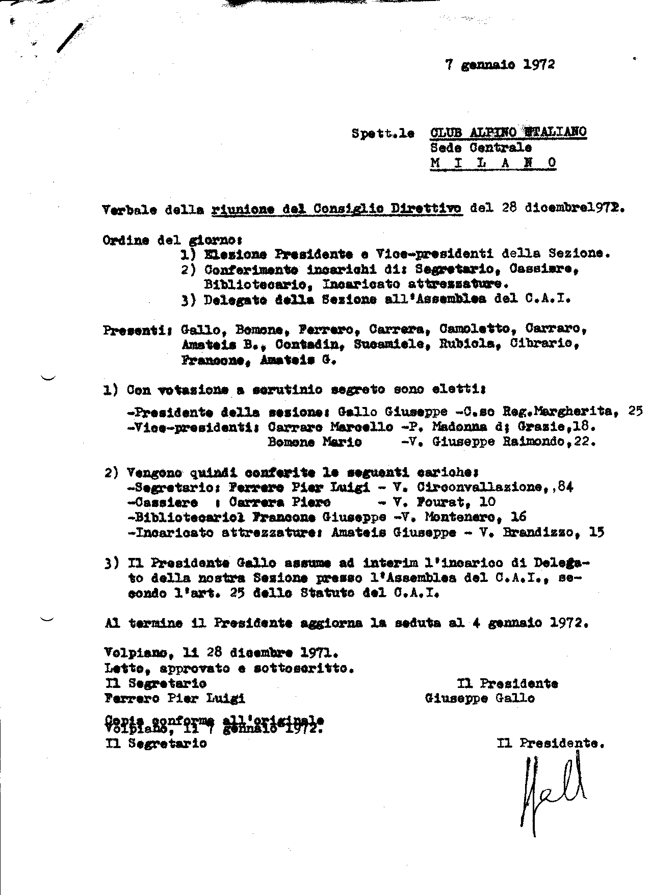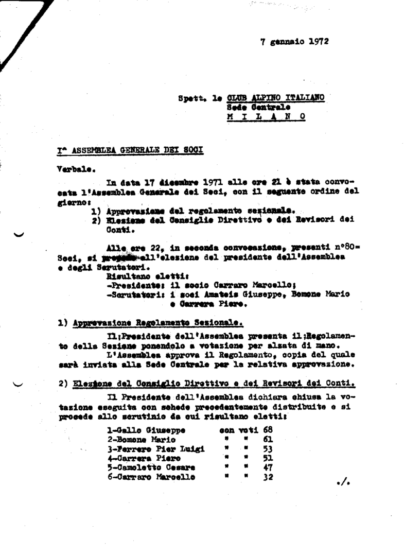 Verbale del Consiglio Centrale del C.A.I. svolto a Milano il 27/11/1971 (presente al Consiglio anche Ceriana, Presidente della Sezione di Torino)